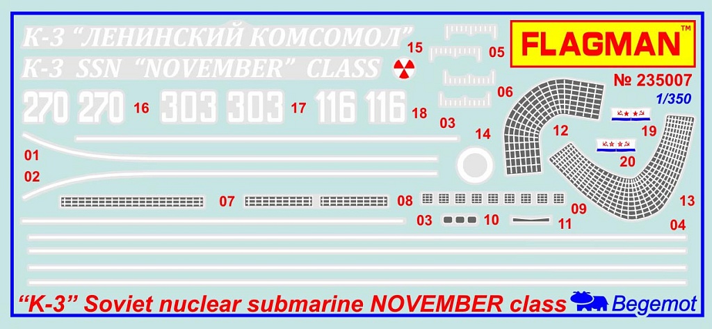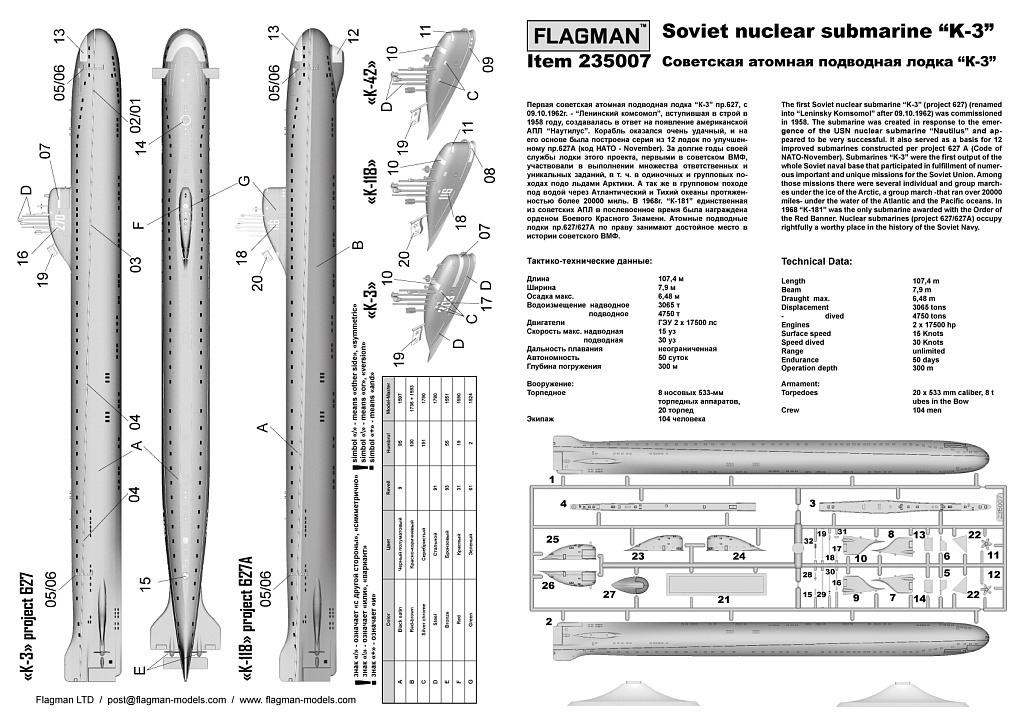 The first Soviet nuclear submarine "K-3" (project 627) (awarded the name "Leninsky Komsomol" after 09.10.1962) was commissioned in 1958. The submarine was created in response to the emergence of the American nuclear submarine "Nautilus" and appeared to be very successful. It also served as a basis for 12 improved submarines constructed per project 627A (NATO code name ? November class). Submarines "K-3" were the first output of the whole Soviet naval base that participated in fulfillment of numerous important and unique missions for the Soviet Union. Among those missions there were several individual and group cruises under the ice of the Arctic, a group cruises that ran over 20000 miles under the water of the Atlantic and the Pacific oceans. In 1968 "K-181" was the only submarine in USSR awarded with the ?Order of the Red Banner? in post-war period. Nuclear submarines (project 627/627?) occupy rightfully a worthy place in the history of the Soviet Navy.