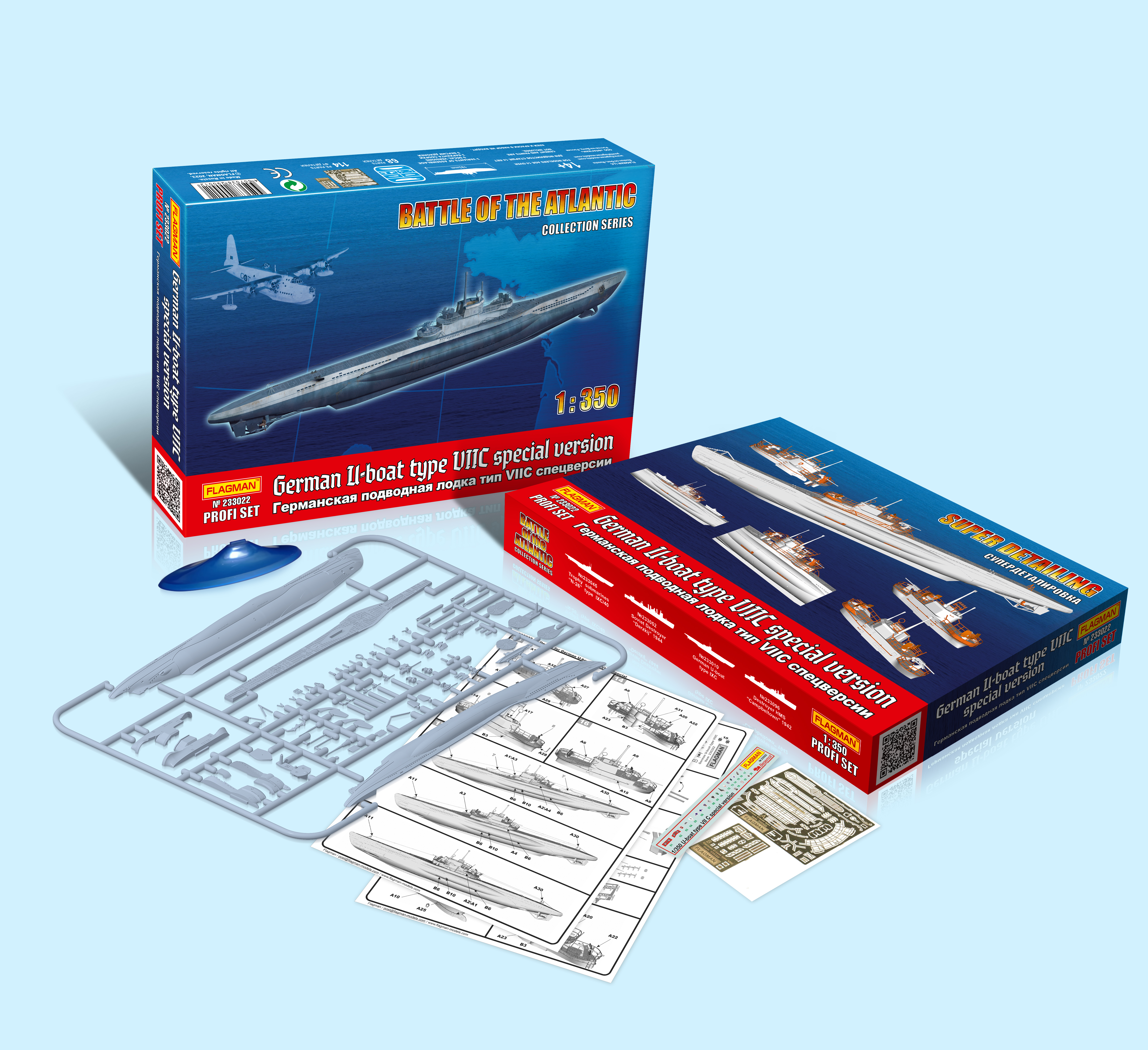 Уважаемые друзья! Представляем Вашему вниманию первую новинку из коллекционной серии «Битва за Атлантику» - это модель №233022 «Германская подводная лодка типа VIIC спецверсий» в исполнении «Profi Set». Главное отличие от предыдущего выпуска этой популярной (в основном из-за отсутствия аналогов) модели состоит в новой коробке – она стала более красочной и прочной, способной самостоятельно выдержать суровые условия доставки.